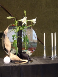 ![]() We gedenken vandaag de mensen die ons zijn voorgegaan en waarmee we ons verbonden weten. De schikking ligt op een bed van mos wat de aarde weergeeft. De grote bladeren ten teken dat we gedragen worden door God, de klimop als symbool voor trouw. Het witte kleed geeft zuiverheid en stilte weer. Twee bogen geven de verbinding weer tussen God en de aarde en zijn liefde voor de mensen. De kronkelwilg verwijst naar de levensweg van hen die we gedenken, de lelies symboliseren reinheid en verbondenheid. Het licht van de kaars als teken van Gods aanwezigheid. | ||