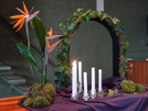![]() Vanavond gedenken wij het lijden en sterven van Jezus. Het zwarte kleed staat voor duisternis, dood, verdriet en verlatenheid. Het kruis achter de poort verwijst naar de kruisiging en het sterven van Jezus. De rode anemonen symboliseren het bloed van Jezus en de rode doek de lijdensweg die Hij moest gaan door de donkere poort. De gedoofde kaarsen geven de donkerheid weer die over de wereld is gekomen. | ||