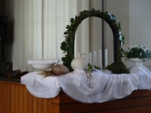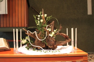 ![]() De schikking staat op een kleed van jute, wat duidt op eenvoud. *Het mos geeft hoop voor de toekomst. *De klimop vertelt ons van Gods trouw, Hij verlaat ons nooit. *Aarde, tarwe en brood: God kan ons groei brengen. Dat de tarwe ontkiemen en groeien mag en dan kan dienen tot ons dagelijks voedsel. De witte tulpen symboliseren de biddende gemeente. De bloembladen staan open naar de hemel. | ||