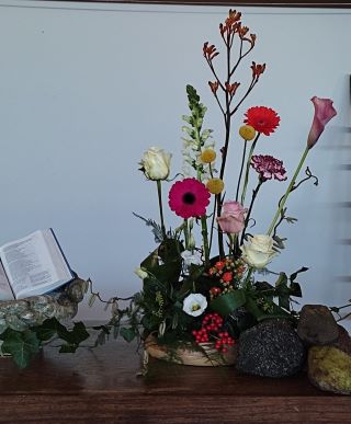![]() Doopdienst zondag 7 juli 2024 van Febe Pauline De witte bloemen spreken van vreugde, blijdschap en feest dat Febe Pauline gezond geboren is! Het vingerblad dat het stukje ondersteunt verbeelden Gods dragende handen waarop de roze Gerbera en de parel, die verbeelden Febe Pauline als een parel in Gods hand. De rode rozen staan voor Bauke, Evie en de zusjes Marije en Naomie en de liefde en zorg voor het nieuw geboren kindje. Rondom het stukje zit klimop als teken van Gods trouw die met jullie meegaat. Het gipskruid en de kleine witte bloementjes geven weer de familie en iedereen die met zorg en liefde om het gezin heen staan! Door het water vroeg of later kom je dichter bij het geheim. In de hoge hemel staat er dat je kind van ’t licht mag zijn. ![]() Pinksteren 19 mei 2024 De rode bloemen en de grassen die er boven uitsteken syboliseren de vlammen en tongen van vuur en de wind die de Geest van God over de wereld verspreid. Vlammen zijn er vele, één is het licht, licht van Jezus Christus, één is het licht, wij zijn één in Christus. Waar de Geest is worden mensen aangesproken en met elkaar verbonden. Het pinksterfeest is het feest van samen kerk zijn. Het is een uitnodiging om meete gaan in de pelgrimsstoet van gelovigen van alle tijden en plaatsen. Om samen te getuigen van geloof, hoop en liefde- elk met eigen inbreng en gaven” ![]() ![]() Bevestiging ambtsdragers en wijkmedewerkers 21 April 2024 Uitleg liturgische schikking. De ring in het bloemstuk als teken van de "Ferbining” die wij koesteren met elkaar, de verschillende bloemen (veelkleurige gemeente) geven aan dat we samen voor die”Ferbining” verantwoordelijk zijn. De ambtsdragers en wijkmedewerkers die afscheid nemen van hun functie en de nieuwe ambtsdragers en wijkmedewerkers dragen wij als gemeente dan ook een warm hart toe! De rode rozen staan voor de liefde en warmte die de ambtsdragers en wijkmedewerkers de gemeente gaan geven of gegeven hebben, de rozen staan ook voor geheimhouding en vertrouwen. Het handvormig blad wil zeggen dat de nieuwe ambtsdragers en wijkmedewerkers worden gedragen door onze Hemelse Vader! Ook voor ons als gemeente is het onze opdracht elkaar te dragen en tot steun te zijn! ![]() Witte donderdag 2024 Hierop zei Jezus: ‘(…) Jullie zijn dus rein – maar niet allemaal.’ (Johannes 13:11) Jezus gebruikt het voetwassen om de discipelen iets te leren en het is een oproep om te handelen. Hij inspireert degenen die het zien. Jezus is het die zijn leven opoffert om het ”vuil” van de leerlingen (de wereld) op zich te nemen, en Hij schenkt de schoonheid van het eeuwige leven. Daarmee roept Hij de leerlingen op om een dienaar voor elkaar te zijn en Zijn voorbeeld te volgen. ![]() Schikking: In de bol zijn klokjesbloemen geplaatst, de oproep om dienaar te zijn. Meditatieve tekst klokjesbloemen herinneren ons aan dankbaarheid en liefde voor dienende leider. Bevestiging Ouderenwerker Jan Tempelman op zondag 21-01-2024